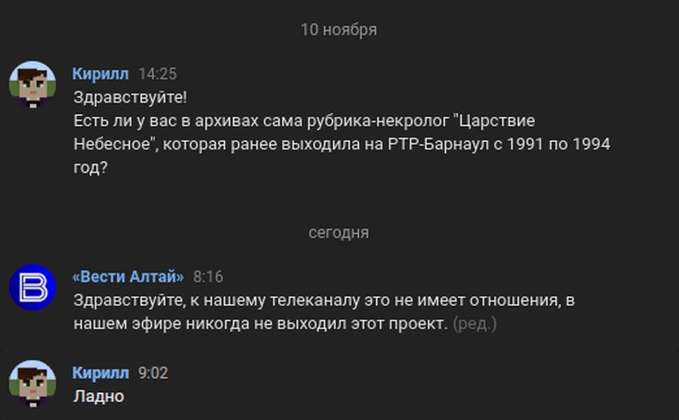 10 ноября 2022 года пользователем Утерянных Медиа Вики PrestigiousLynx4378 было написано письмо группе «Вести Алтай» (также ГТРК Алтай) во ВКонтакте, которая по слухам отвечала за создание некролога. 12 ноября «Вести Алтай» ответили, что не имеют отношения к данной рубрике.[8]